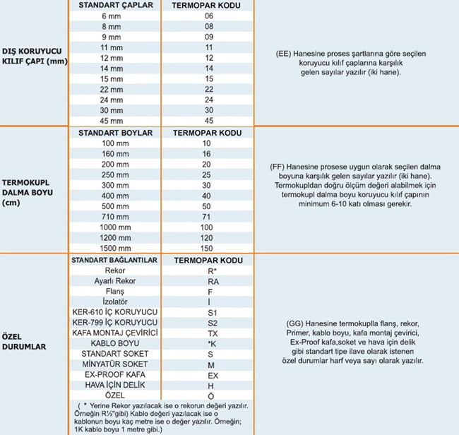 özel termokupllar haricinde özel tip termokupllar ayrı bir kodlama ile belirtilir. |